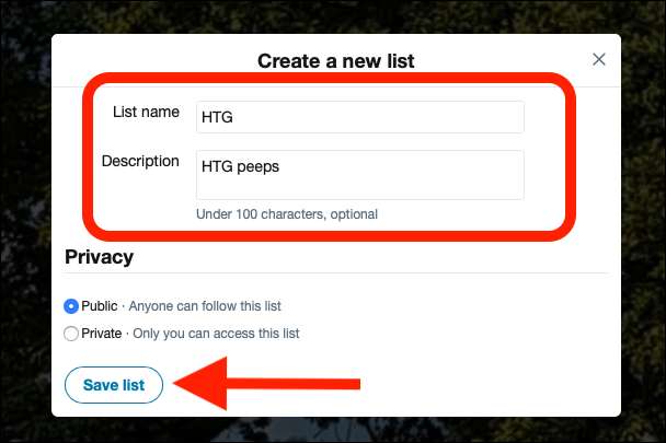 Geben Sie einen Namen für Ihre Liste und eine optionale Beschreibung ein, wenn Sie möchten. Wählen Sie "Öffentlich" oder "Privat" (dies ist ein Kontrollkästchen unter Android), um zu steuern, wer die Liste und die darin enthaltenen Konten sehen kann. Klicken Sie zum Abschluss auf "Liste speichern" oder tippen Sie auf "Fertig", wenn Sie mobil sind.