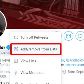 Gehen Sie zum Profil einer Person, die Sie einer Liste hinzufügen möchten. Klicken Sie auf die drei vertikalen Punkte rechts neben der Profilseite des Kontos (oder tippen Sie auf dem Handy auf die Auslassungspunkte) und klicken Sie dann auf die Schaltfläche "Aus Listen hinzufügen / entfernen".