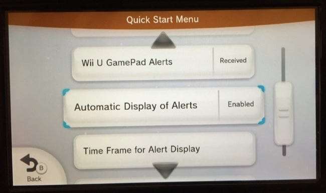 Stellen Sie die automatische Anzeige von Warnungen auf Nein. Das GamePad schaltet sich nicht mehr automatisch ein und spielt einen Ton ab, der Ihnen diese Werbung anzeigt. Sie werden sie immer noch sehen, wenn Sie das GamePad selbst einschalten. Dies ist also eine gute Lösung, wenn Sie tatsächlich Benachrichtigungen über neue Spiele sehen möchten - aber nach Ihrem eigenen Zeitplan, nicht immer dann, wenn Nintendo Lust auf Werbung bei Ihnen hat.