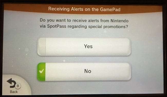 Wenn Sie überhaupt keine Benachrichtigungen erhalten möchten, tippen Sie hier auf die Option "Wii U GamePad-Benachrichtigungen" und setzen Sie sie auf "Nein". Dadurch werden alle "Warnungen von Nintendo über SpotPass bezüglich Sonderaktionen" verhindert. SpotPass ist der Teil der Wii U, der im Ruhemodus im Hintergrund ausgeführt wird und automatisch neue Firmware-Updates, Spiele-Patches und - ja - "Warnungen" herunterlädt, die Ihnen angezeigt werden.
