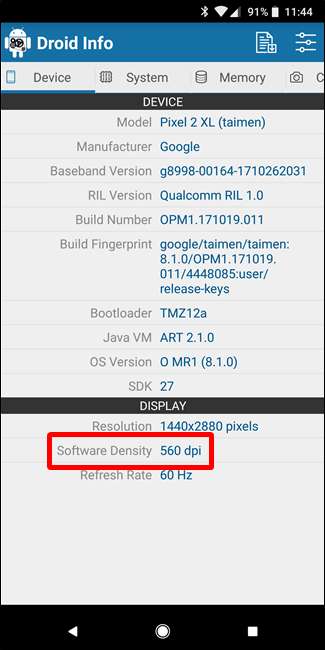 Die erste Registerkarte, die Sie anzeigen möchten, ist die Registerkarte "Gerät", auf der die App standardmäßig geöffnet wird. Hier gibt es zwei wichtige Informationen: DPI- und Android-Betriebssystemversion.