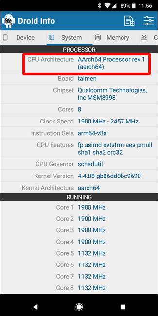 - Die Architektur: Dies bezieht sich auf den Prozessortyp in Ihrem Telefon. Normalerweise sind die Optionen arm, arm64, x86 und x86_64. ARM und x86 sind für 32-Bit-Prozessoren, während arm64 und x86_64 für 64-Bit-Prozessoren sind. Wir werden dies weiter unten näher erläutern.