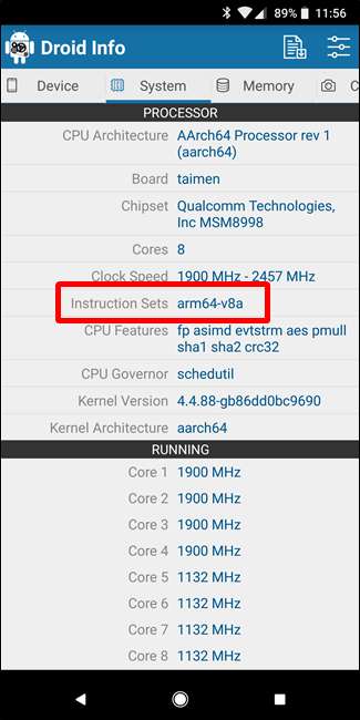 Wenn Sie im Architekturnamen zunächst "64" sehen, können Sie so ziemlich garantieren, dass es sich um ein 64-Bit-Gerät handelt. Leicht genug. Um herauszufinden, ob es sich um ARM oder x86 handelt, sehen Sie sich den Abschnitt "Befehlssatz" an. Auch hier suchen Sie nur nach grundlegenden Informationen wie den Buchstaben "Arm".