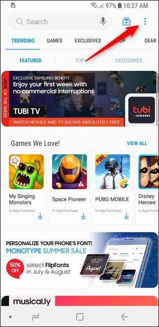 Öffnen Sie zunächst den Galaxy Apps Store - er befindet sich im Samsung-Ordner, wenn Sie den Stock Launcher verwenden - und tippen Sie dann auf die dreipunktige Menüschaltfläche in der oberen rechten Ecke. Wählen Sie im Dropdown-Menü den Befehl "Einstellungen".