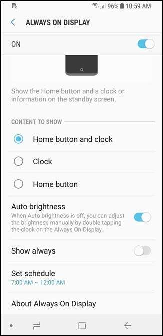 Um diese Funktion anzupassen, gehen Sie zu Einstellungen> Bildschirm sperren und Sicherheit> Immer angezeigt. Hier können Sie den Zeitplan, wenn Always On Display aktiviert ist (damit er nachts nicht ablenkt), die Helligkeitsstufe und den anzuzeigenden Inhalt anpassen.