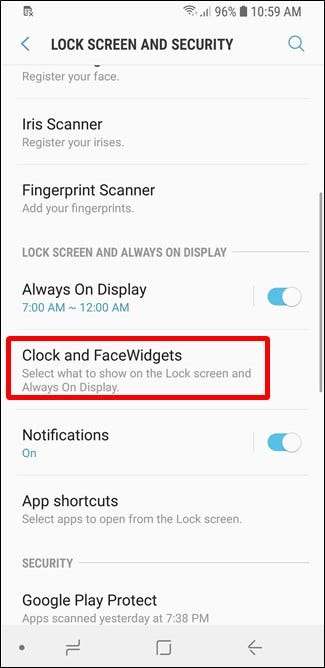 Um noch einen Schritt weiter zu gehen, gehen Sie zu Einstellungen> Bildschirm sperren und Sicherheit> Uhr und FaceWidgets. Hier können Sie den Uhrstil sowie die Widgets ändern, die auf dem Always On Display angezeigt werden. Samsung nennt dies aus irgendeinem Grund „FaceWidgets“.