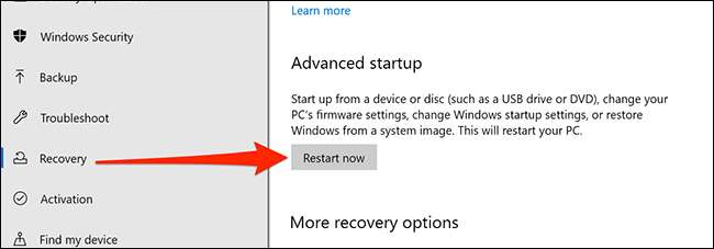 Im Fenster Einstellungen klicken Sie auf „Recovery“ in der linken Seitenleiste. Finden Erweiterte Start auf der rechten Seite und klicken Sie auf „Jetzt neu starten“ darunter.