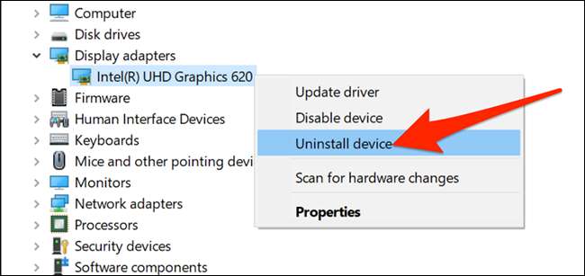 Auf dem Geräte-Manager-Fenster klicken Sie auf den Pfeil neben „Display-Adapter.“ Rechtsklick auf den Adapter, dass zeigt in diesem erweiterten Menü, dann wählen Sie „Uninstall-Gerät.“