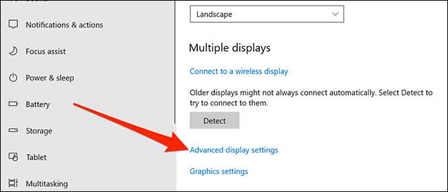 Klicken Sie auf „Anzeige“ in der linken Seitenleiste. Blättern Sie in der rechten Fensterbereich und unter Mehrere Anzeigen, klicken Sie auf „Erweiterte Anzeigeeinstellungen.“