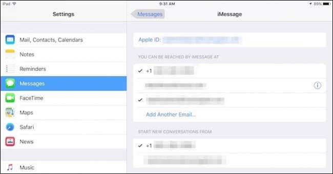 In den Nachrichteneinstellungen werden zwei Optionskategorien angezeigt: "Sie können von iMessage um erreicht werden" und "Neue Konversation starten von". Stellen Sie sicher, dass Ihre Telefonnummer, dh die Nummer Ihres iPhones, ausgewählt ist.