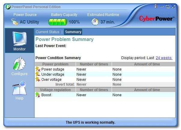Während die erste Registerkarte eine aktuelle Übersicht bietet, bietet die zweite Registerkarte eine historische Ansicht. Es ist ideal, hier eine ganze Reihe von "nie" und "keine" zu sehen, da dies bedeutet, dass Ihre USV-Einheit nicht in Aktion treten musste, um Stromprobleme bei Ihnen zu Hause oder im Büro zu lösen. Wenn Sie hier jedoch Beweise dafür sehen, dass Sie Stromprobleme hatten, können Sie sich darauf verlassen, dass das Gerät diese für Sie behandelt hat. Nebenbei bemerkt, die Aufzeichnung basiert ausschließlich auf Software und nicht auf Hardware in der USV-Einheit. Wenn Sie die Software gerade installiert haben, werden keine Probleme angezeigt, die aufgetreten sind, während die USV-Einheit aktiv war, aber nicht mit der Agentensoftware verbunden war.