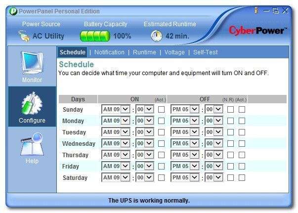 Nächster Halt: das Konfigurationsmenü. Hier können wir ein paar praktische kleine Extras einrichten. Die erste Registerkarte bietet eines der handlichsten Bonus-Tools, die Sie mit der USV-Einheit erhalten: die Energieplanung.