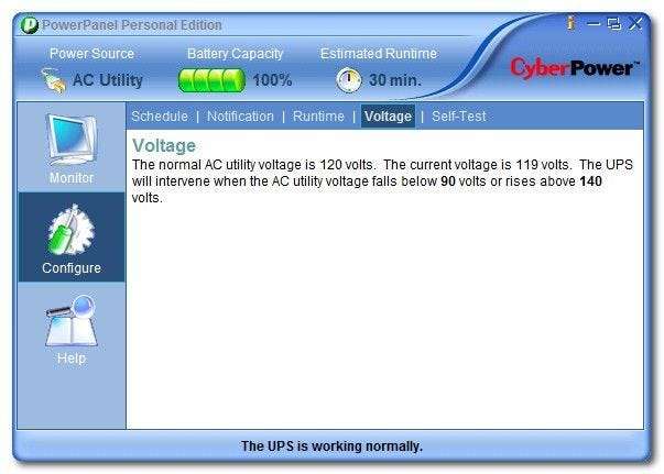 Wenn Sie die Software zum ersten Mal starten, gelangen Sie wie oben gezeigt zum Statusmenü. Diese Dashboard-Ansicht ist eine hervorragende Möglichkeit, den allgemeinen Zustand Ihrer USV-Einheit zu überprüfen. Hier können wir ausgehend vom Anfang der Liste sehen, dass das Gerät mit Wechselstrom betrieben wird, die Spannungsversorgung bei 118 Volt stabil ist, kein abnormaler Stromzustand vorliegt (keine Unter- oder Überspannung, verschmutzte Stromversorgung usw.) Der Akku ist voll aufgeladen, eine geschätzte Laufzeit, wenn wir Strom verlieren, und die Belastung des Geräts.