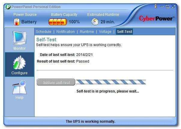 Die letzte Registerkarte ist der Selbsttest. Sie sollten den Selbsttest mindestens einmal im Monat durchführen. Wenn Sie den Selbsttest durchführen, unterbricht die USV-Einheit den Wandstrom und führt einen Diagnosetest von ca. 10 Sekunden durch, um zu bestätigen, dass alles im Gerät (Schaltkreise, Akkupack usw.) ordnungsgemäß funktioniert. Warten Sie nicht auf einen tatsächlichen Stromausfall, um Ihr Setup zu testen, sondern testen Sie es im Voraus.