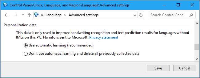 Das automatische Lernen ist standardmäßig aktiviert. Um zu überprüfen, ob es noch aktiviert ist, klicken Sie im linken Bereich des Fensters "Systemsteuerung> Uhr, Sprache und Region> Sprache" auf den Link "Erweiterte Einstellungen". Stellen Sie unter Personalisierungsdaten sicher, dass die Option auf "Automatisches Lernen verwenden (empfohlen)" eingestellt ist, damit das System automatisch versucht, Ihre Handschrift zu lernen.