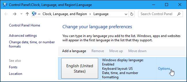 Diese Option ist in der alten Systemsteuerungsoberfläche weiterhin verfügbar. Um es zu finden, gehen Sie zu Systemsteuerung> Uhr, Sprache und Region> Sprache. Klicken Sie auf die Schaltfläche "Optionen" rechts neben der von Ihnen verwendeten Sprache.