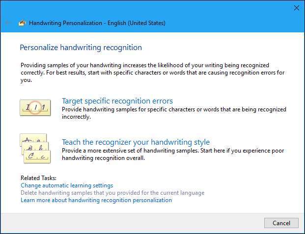 Der Assistent zur Personalisierung der Handschrift wird angezeigt. Sie können hier eine von zwei Optionen auswählen, um Ihre Handschrifterkennung zu verbessern.