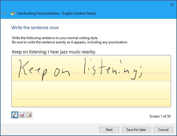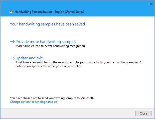 Sie müssen nicht alle Beispiele bereitstellen, die das Tool anfordert. Sie können jederzeit auf "Für später speichern" und dann auf "Aktualisieren und beenden" klicken, um Ihre Handschriftmuster zu speichern. Je mehr Beispiele Sie bereitstellen, desto besser kann Windows Ihre Handschrift verstehen.