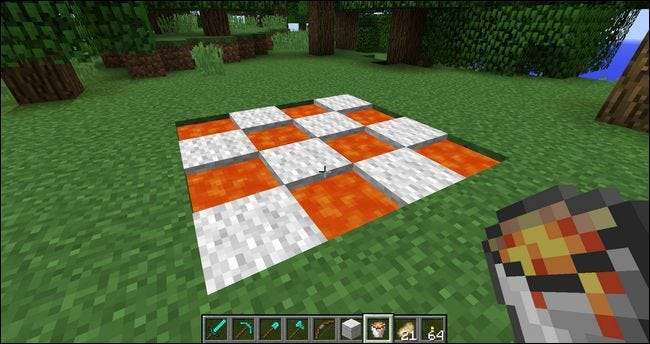 Es verhindert nicht nur, dass Blitzeinschläge und andere natürliche Feuerquellen Dinge beschädigen, sondern ist auch sehr praktisch, wenn Sie Feuer und Lava in Ihre Entwürfe integrieren möchten, ohne sich Sorgen machen zu müssen, dass in der Nähe brennbare Strukturen in Rauch aufgehen. Wenn die Feuerausbreitung deaktiviert ist, können Sie unwahrscheinliche Dinge tun, z. B. ein Schachbrett aus Woll- und Lavablöcken bauen (siehe oben).
