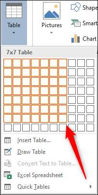 Ein Dropdown-Menü wird angezeigt. Bewegen Sie die Mauszeigersinn über das Netz, um entweder die Anzahl der Zeilen und Spalten in der Tabelle zu erhöhen oder zu verringern. Für den Kalender benötigen Sie eine 7 × 7-Tabelle, so dass Sie Ihre Maus über das entsprechende Quadrat im Raster bewegen, und klicken Sie darauf, um den Tisch einzufügen.