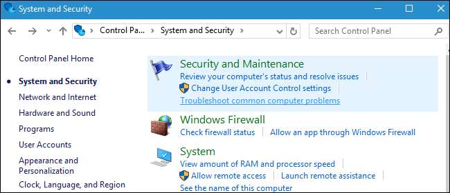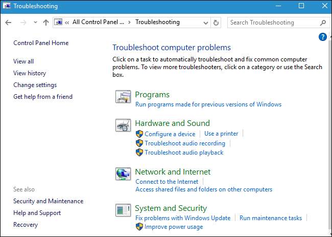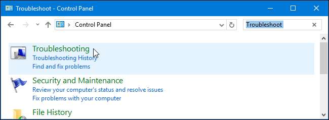 Diese sind bei Bedarf weiterhin verfügbar - sie sind nur in der Systemsteuerung vergraben. Um sie zu finden, öffnen Sie die Systemsteuerung, geben Sie "Fehlerbehebung" in das Suchfeld ein und klicken Sie auf das Symbol "Fehlerbehebung".