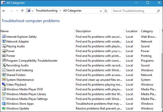 Dies sind nicht die einzigen verfügbaren Problemlöser. Klicken Sie in der Seitenleiste auf "Alle anzeigen", um eine vollständige Liste der Problemlöser anzuzeigen. Hier ist eine Liste der Problemlöser, die Sie möglicherweise finden, obwohl nicht alle Windows-Versionen dieselben Fehlerbehebungen enthalten: