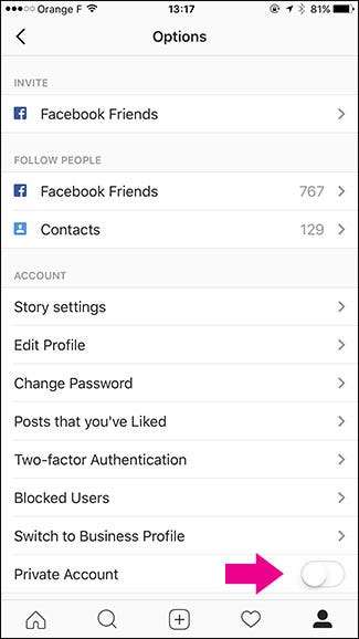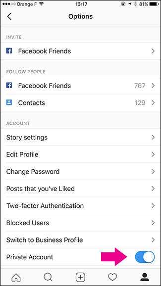 Dadurch gelangen Sie zum Bildschirm Einstellungen. Schalten Sie unten den Schalter "Privates Konto" ein.