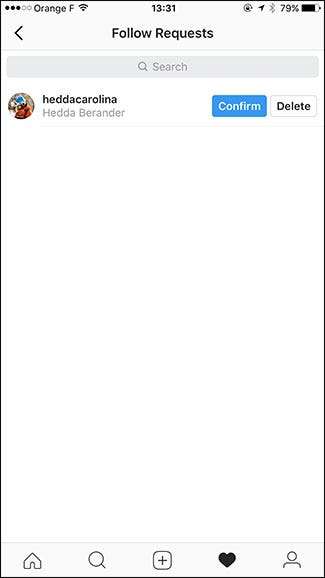 Wenn jemand Neues versucht, Ihnen zu folgen, sendet er eine Follow-Anfrage. Wenn Sie sich das nächste Mal bei der App anmelden, erhalten Sie eine Benachrichtigung. Tippen Sie auf das Herzsymbol, um es anzuzeigen.