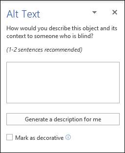 Der Bereich "Alt Text" erscheint das Recht des Word-Dokuments. Hier können Sie Ihren eigenen Alt-Text schreiben, wobei das Wort eine Beschreibung für Sie generiert oder die Grafik als dekorativ markieren.