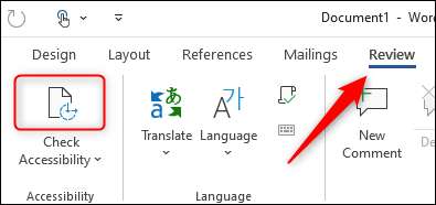 Um den Accessility-Checker verwenden zu können, klicken Sie auf die Registerkarte "Review" und klicken Sie dann auf das Symbol oben "Überprüfen Sie den Zugangsfreiheit" in der Gruppe "Zugänglichkeit".