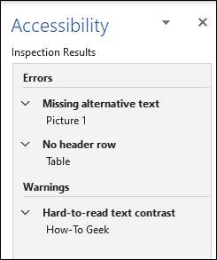 Die Ergebnisse der Inspektion werden im Bereich "Zugänglichkeit" rechts neben dem Dokument angezeigt. Hier können Sie die zurückgegebenen Fehler und Warnungen überprüfen.