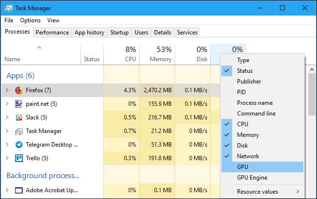 Klicken Sie in der Vollansicht des Task-Managers auf der Registerkarte "Prozesse" mit der rechten Maustaste auf eine beliebige Spaltenüberschrift, und aktivieren Sie dann die Option "GPU". Dadurch wird eine GPU-Spalte hinzugefügt, in der Sie den Prozentsatz der von jeder Anwendung verwendeten GPU-Ressourcen anzeigen können.