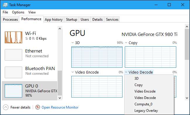 Windows zeigt hier die GPU-Nutzung in Echtzeit an. Standardmäßig versucht der Task-Manager, die interessantesten vier Engines entsprechend den Vorgängen auf Ihrem System anzuzeigen. Hier werden unterschiedliche Grafiken angezeigt, je nachdem, ob Sie beispielsweise 3D-Spiele spielen oder Videos codieren. Sie können jedoch auf einen der Namen über den Diagrammen klicken und eine der verfügbaren Engines auswählen, um auszuwählen, was angezeigt wird.