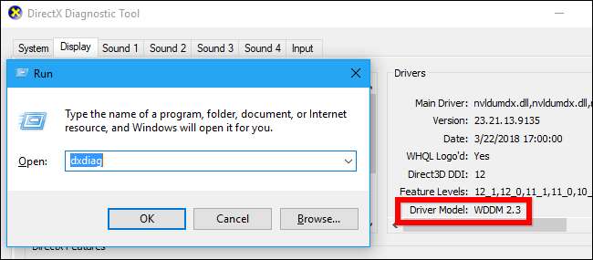 Sie können überprüfen, welche Version von WDDM Ihr GPU-Treiber verwendet, indem Sie Windows + R drücken, "dxdiag" in das Feld eingeben und dann zum Öffnen die Eingabetaste drücken das DirectX-Diagnosetool . Klicken Sie auf die Registerkarte "Anzeige" und suchen Sie rechts unter "Treibermodell" unter "Treiber". Wenn Sie hier einen "WDDM 2.x" -Treiber sehen, ist Ihr System kompatibel. Wenn Sie hier einen "WDDM 1.x" -Treiber sehen, ist Ihre GPU nicht kompatibel.