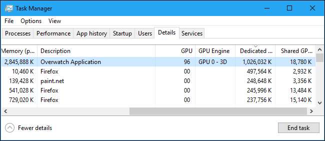 In der Spalte GPU Engine wird jede Anwendung angezeigt, die verwendet wird. Dies zeigt Ihnen sowohl, welche physische GPU eine Anwendung verwendet als auch welche Engine sie verwendet - beispielsweise, ob sie die 3D-Engine oder die Video-Decodierungs-Engine verwendet. Sie können feststellen, welche GPU einer bestimmten Nummer entspricht, indem Sie auf die Registerkarte Leistung klicken, auf die im nächsten Abschnitt eingegangen wird.