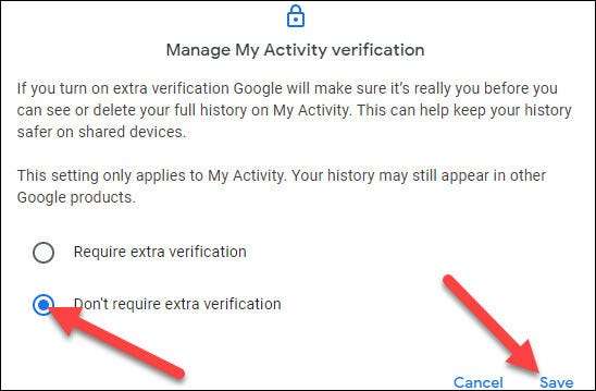 Um diese Funktion zu deaktivieren, gehen Sie einfach zur Seite "Meine Aktivitätsüberprüfung verwalten", wählen Sie "Keine zusätzliche Überprüfung an, und klicken Sie auf" Speichern ". Dies ist standardmäßig nicht aktiviert, sodass Sie es nur ausschalten müssen, wenn Sie es zuvor aktiviert haben.