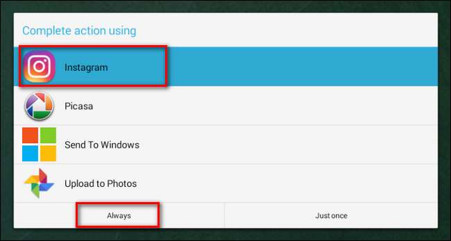 Wenn Sie die gewünschte Datei ausgewählt haben, werden Sie aufgefordert, auszuwählen, welche Anwendung auf dem emulierten Android-Gerät die Datei verarbeiten soll. Wählen Sie "Instagram" und klicken Sie auf die Schaltfläche "Immer".