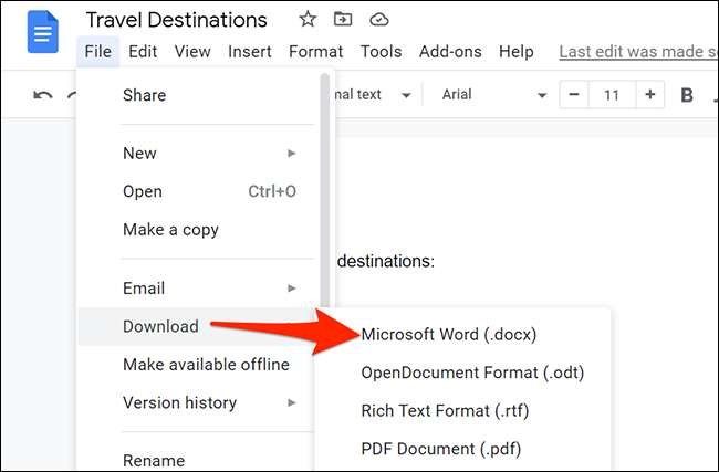 Wenn Google Docs 'Editing Screen angezeigt wird, klicken Sie auf Datei & GT; Download & GT; Microsoft Word in der Menüleiste. Dadurch wird Ihr Dokument als Word-Datei heruntergeladen.