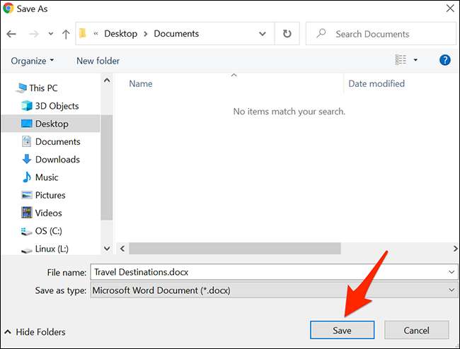 Wählen Sie im Fenster "Speichern unter", das öffnet, einen Ordner, um Ihr Dokument zu speichern, und klicken Sie unten im Fenster auf "Speichern".
