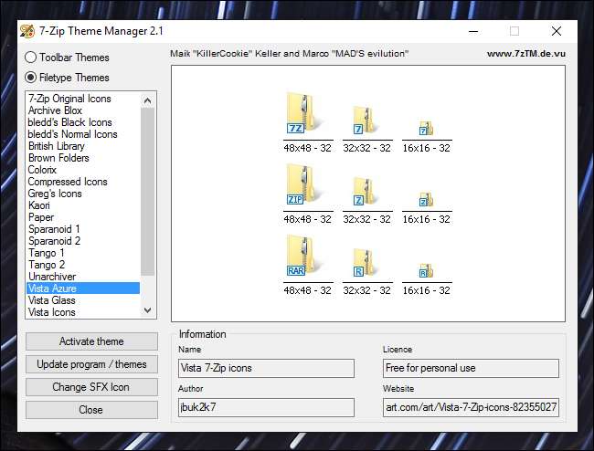 Durchsuchen Sie erneut die linke Seitenleiste, um die verschiedenen verfügbaren Themen anzuzeigen. Das Thema "Vista Azure" ähnelt am ehesten den Standard-ZIP-Symbolen von Windows. Daher habe ich dieses ausgewählt. (Beachten Sie, dass einige Themen, einschließlich Vista Azure, nicht alle möglichen Symbole enthalten. Einige dunkelere Formate enthalten möglicherweise noch die alten Symbole. Sie müssen experimentieren.)