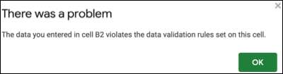 Wenn du wählst Warnung anzeigen [fünfzehn] , sehen Sie eine Fehleranzeige (rotes Dreieck) in der oberen rechten Ecke der Zelle. Bewegen Sie Ihren Cursor darüber, um die Warnmeldung anzuzeigen.