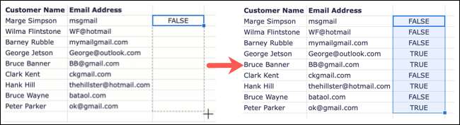 Wenn Sie eine gesamte Spalte von E-Mail-Adressen haben, die Sie überprüfen möchten, können Sie wie in unserem Beispiel den Füllgriff verwenden, um die Funktion auf die verbleibenden Zellen zu kopieren.