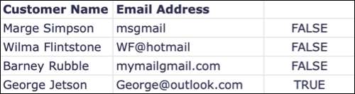 Für alle E-Mails in dieser Spalte Ihres Blatts. Als Beispiele haben wir eine E-Mail-Adresse ohne Symbol oder Erweiterung hervorgehoben, wobei nur das Symbol nur mit der Erweiterung und eines mit einem gültigen Format verwendet wird. Sie können im folgenden Screenshot sehen, die ersten drei sind ungültig (FALSE) und der vierte ist gültig (true).