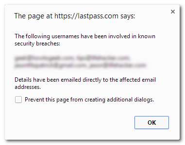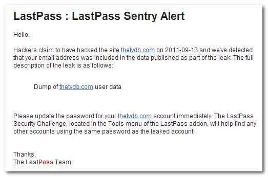 LastPass gibt für jede Instanz eine einzelne Sicherheitswarnung aus. Wenn Sie Ihre E-Mail-Adresse schon lange haben, sollten Sie sich darüber schockieren lassen, wie viele Kennwortverletzungen sich darin verwickelt haben. Hier ein Beispiel für eine Kennwortverletzungsbenachrichtigung: