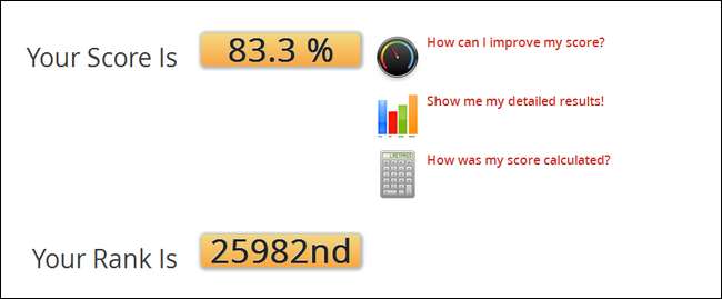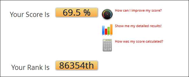 Das ist meine Punktzahl mit jahrelangen zufälligen Passwörtern. Seien Sie nicht zu schockiert, wenn Ihre Punktzahl noch niedriger ist, wenn Sie immer wieder dieselbe Handvoll schwacher Passwörter verwendet haben. Jetzt, da wir unsere Punktzahl haben (wie großartig oder beschämend sie auch sein mag), ist es Zeit, sich mit den Daten zu befassen. Sie können die Quicklinks neben Ihrem Score-Prozentsatz verwenden oder einfach mit dem Scrollen beginnen. Schauen wir uns zunächst die detaillierten Ergebnisse an. Betrachten Sie dies als eine 10.000-Fuß-Übersicht über den Status Ihrer Passwörter: