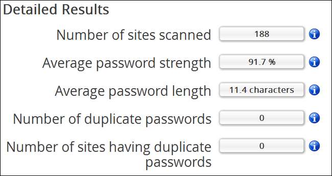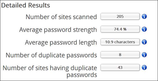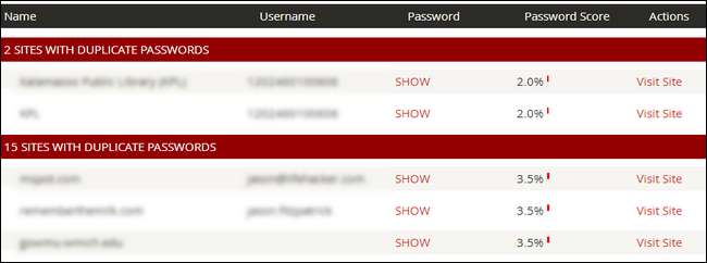Während Sie hier auf alle Statistiken achten sollten, sind die wirklich wichtigen die "Durchschnittliche Passwortstärke", wie schwach oder stark Ihr durchschnittliches Passwort ist und, noch wichtiger, "Anzahl der doppelten Passwörter" und "Anzahl der Websites mit doppelten Passwörtern" ”. Bei meiner Prüfung gab es 8 Dupes an 43 Standorten. Offensichtlich war ich ziemlich faul gewesen, das gleiche minderwertige Passwort auf mehr als ein paar Websites wiederzuverwenden.