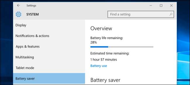 Diese Funktion ist Teil der Bildschirm „Batteriesparmodus“ in der neuen Einstellungen App. Wie einige der anderen neuen Funktionen von Windows 10 war es ursprünglich Teil von Windows Phone, kam jedoch mit der Veröffentlichung von Windows 10 auf den Desktop. Es wird auch aufgeschlüsselt, wie viel Batteriestrom Ihr Display und andere Hardware verbrauchen.
