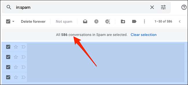 Google Mail wählt alle Ihre Online-Anzeigen-E-Mails aus. Um E-Mails auszuwählen, die nicht auf der aktuellen Seite angezeigt werden, klicken Sie auf die Option "Alle X-Konversationen in Ordner" in der Option Alle X-Konversationen auswählen (wobei "x" die Anzahl der E-Mails ist, die sich in Ihrem ausgewählten Ordner befinden).