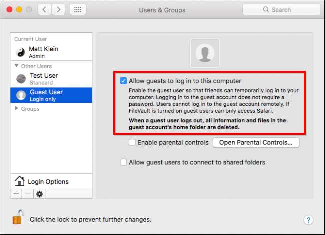 Klicken Sie nach dem Entsperren auf "Gastbenutzer" und aktivieren Sie das Kontrollkästchen neben "Gäste dürfen sich bei diesem Computer anmelden". Wenn Sie das Gastbenutzerkonto nicht mehr benötigen, führen Sie die folgenden Schritte erneut aus und deaktivieren Sie dieses Kontrollkästchen.