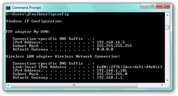Wenn Sie "ipconfig" auf dem lokalen Computer ausführen, sollte dies zeigen, dass Sie sowohl mit dem VPN als auch mit Ihrer vorhandenen Internetverbindung verbunden sind.